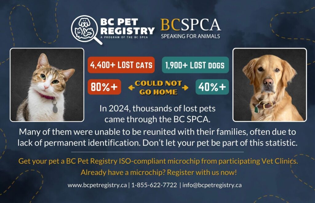 Quick Stat: According to the BC SPCA, over 6,000 lost pets entered into their animal centres for 2024. BC shelters each year. Many arrive without valid identification, making the reunification process far more difficult and stressful for both pets and their families. Don’t let your pet be one of them.